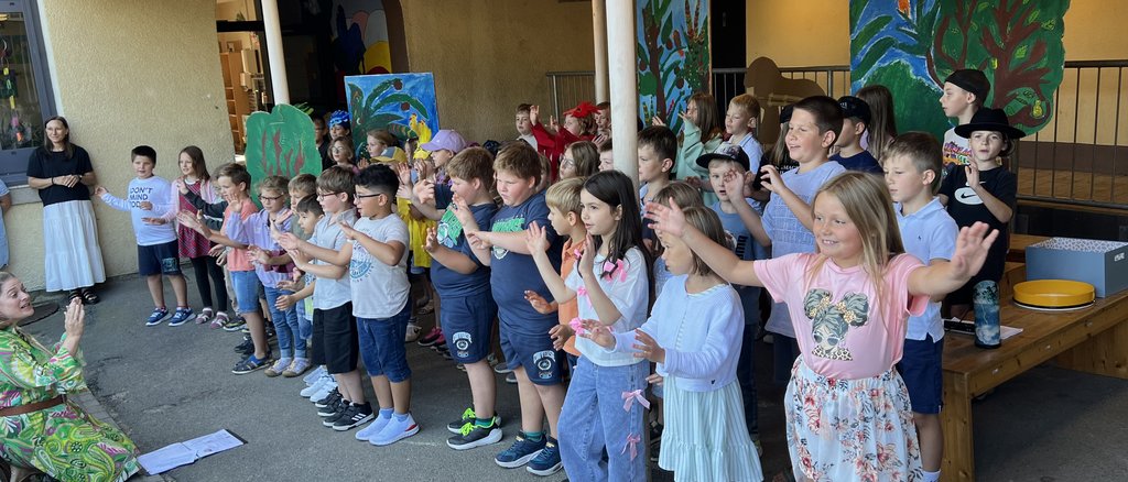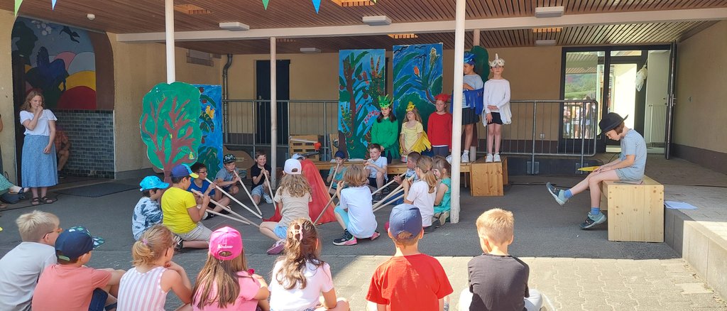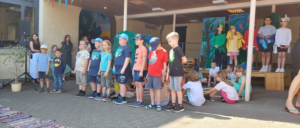 Bei schönstem Sommerwetter durften wir heute viele Kinder, Eltern und Angehörige zu unserem Sommerfest begrüßen. Die Chor- und Theater-AG unter der Leitung von Frau Groß zeigte mit dem Stück „Das Lied der bunten Vögel“ was man alles erreichen kann, wenn man zusammenhält. Mit Liedern und Tänzen wurde die Aufführung von den Kindern der Klassen 1 bis 4 umrahmt.