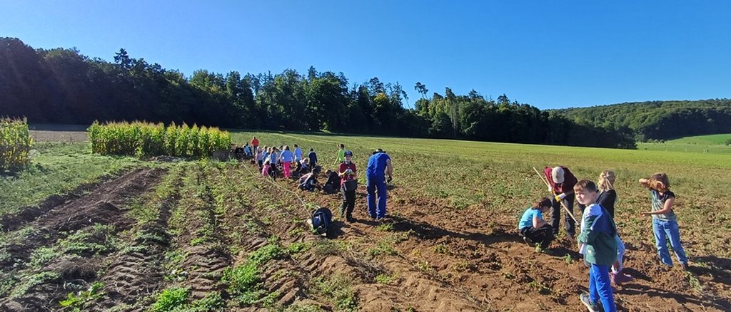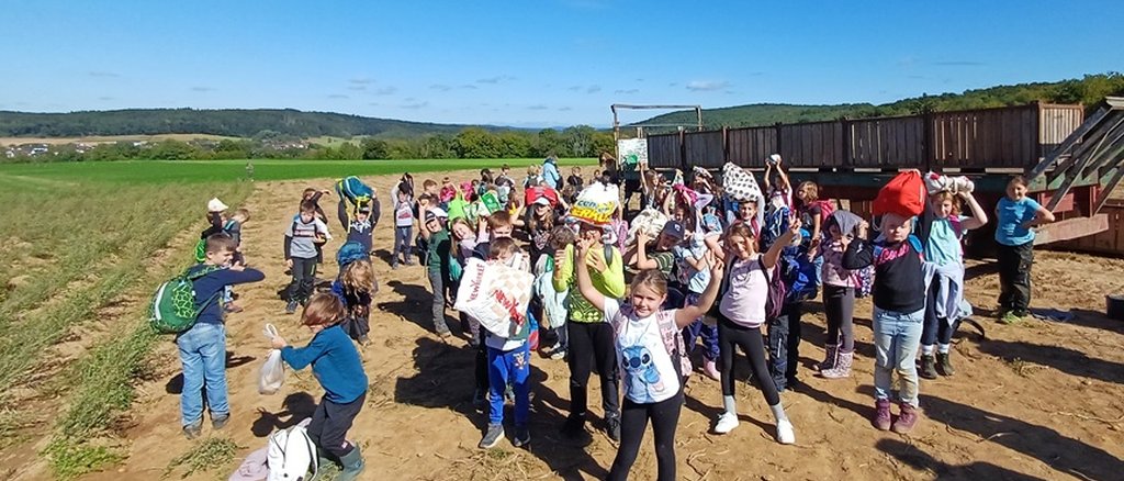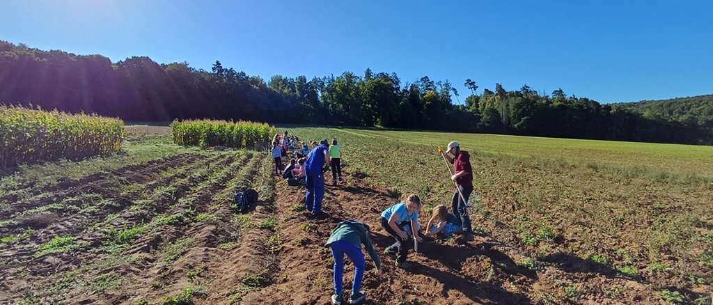 Bei schönstem Spätsommerwetter machte sich die ganze Schule auf eine kurze Wanderung zum Gladbacher Hof. Nach einer kurzen Einweisung, bei der es vielen Kindern schon in den Fingern kribbelte, durften wir den Kartoffelacker stürmen und eifrig bei der Ernte helfen. Besonders große und interessant geformte Kartoffeln wurden bejubelt und herumgezeigt. Die Arbeit ging so gut voran, dass immer wieder neue Kartoffelreihen bereitgestellt werden mussten. Zum Schluss durften sich die Kinder Kartoffeln für Zuhause mitnehmen. Sicherlich gab es in vielen Aumenauer Häusern leckere Kartoffelgerichte. Vielen Dank an die Familie Roth und die Mitarbeitenden des Gladbacher Hofes für die Einladung und die nette Begleitung.